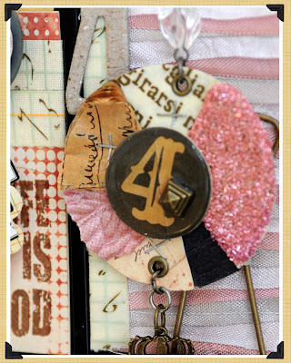 9. finishing touches – slide layered atc with ruffle ribbon layers into holder. wrap a piece of gaffer tape around the center white part of the clip. dangle the pie chart charm piece from the upper right corner of the atc chain right where it meets the metal base.