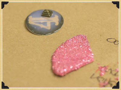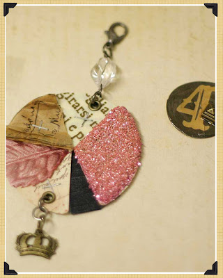 8. punch top & bottom edge of pie chart with crop-a-dile and set your eyelets. add charm crystal dangle to top and crown charm to bottom.