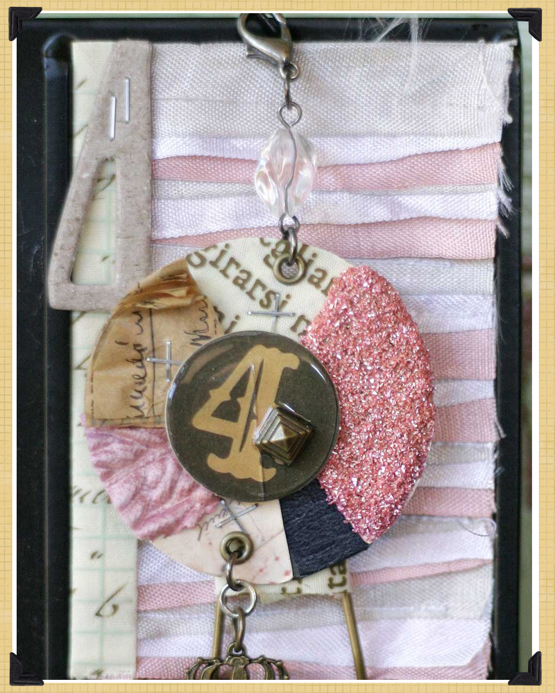 9. finishing touches – slide layered atc with ruffle ribbon layers into holder. wrap a piece of gaffer tape around the center white part of the clip. dangle the pie chart charm piece from the upper right corner of the atc chain right where it meets the metal base.
