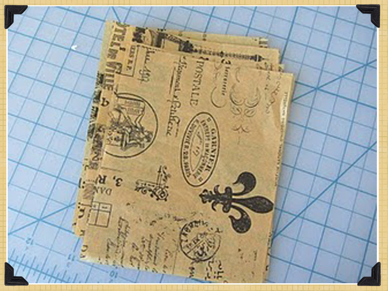 1. Cut 4 or 5 pieces of collage tissue (paris) 4 x 5″. I like to fold up the tissue and cut the squares all at the same time with a rotary cutter. Super easy.