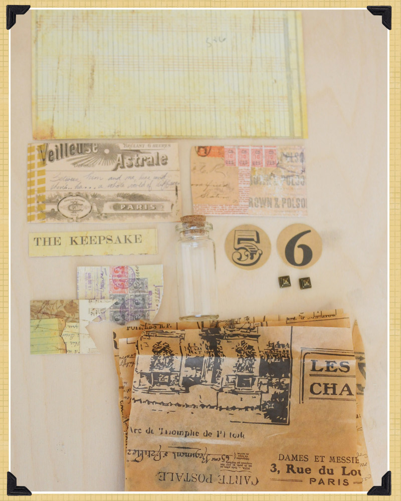 5. Once I was satisfied with the painted board I cut up small pieces of the Lille 6 x 6″ paper (elen), layering as I added them to the base (the eiffel tower part of the paper was used in section #1, so just use any other part of the paper). I also added a small piece of vintage dictionary paper to the left edge because no gypsy project would be complete without a bit of vintage.