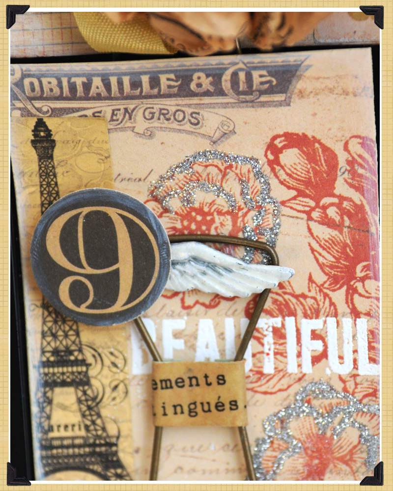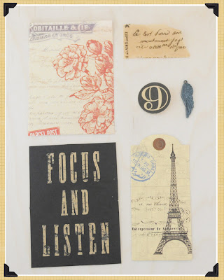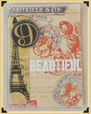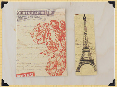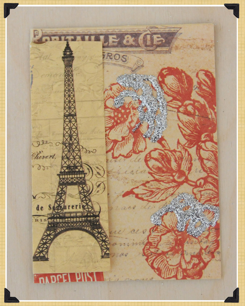 1. Cut 7 Gypsies Lille Patterned paper to size and glue to ATC sized card. Ink Eiffel Tower Tag if desired, and then cut tag with Eiffel Tower image as shown and glue to left side of card.