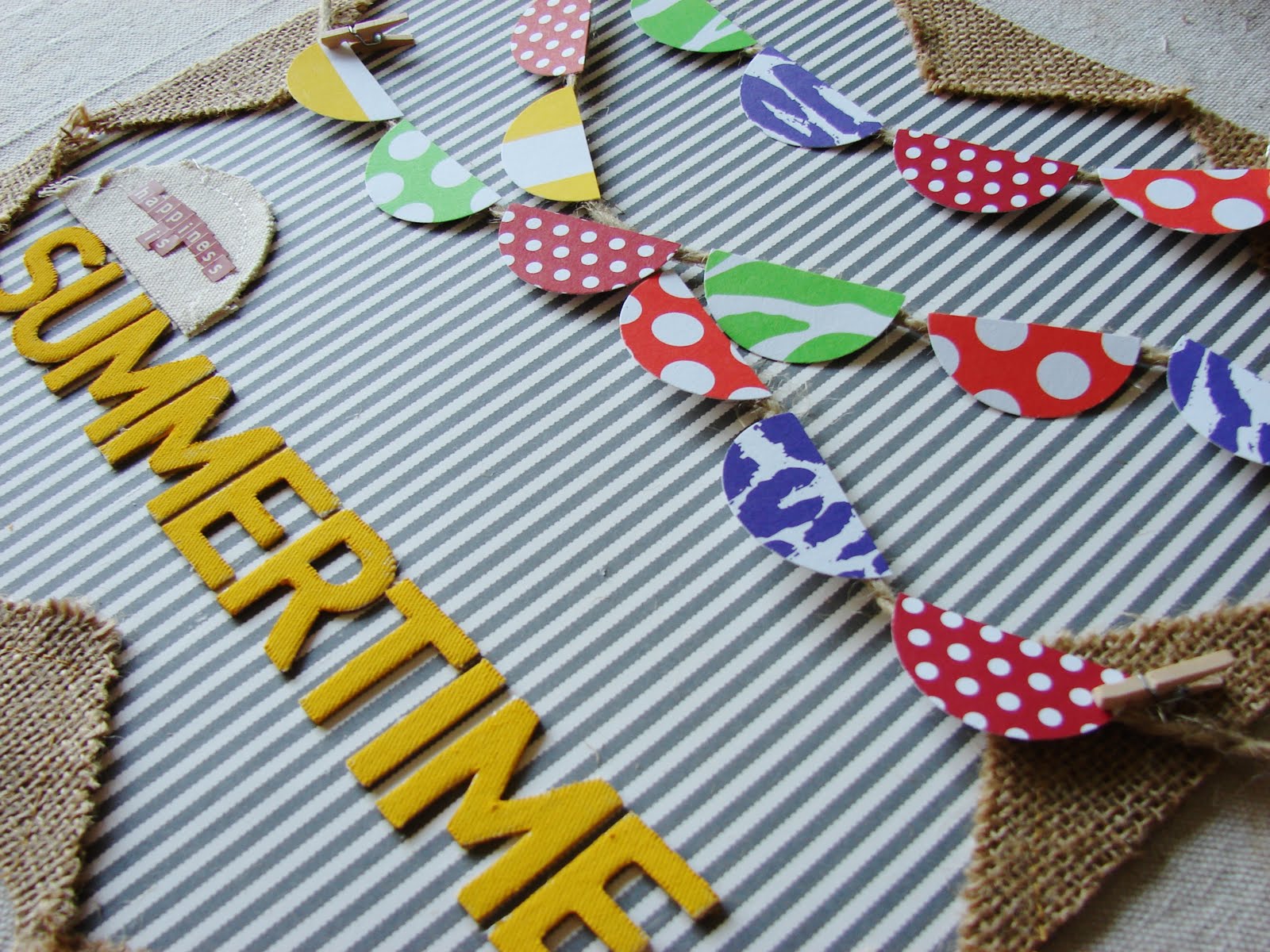 Canvas Corp: all patterned paper, Burlap mini triangles {cut in half for the border}, twine, mini clothespins, Canvas Mini Round shape {cut in half}