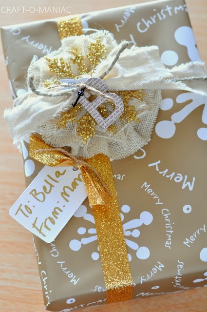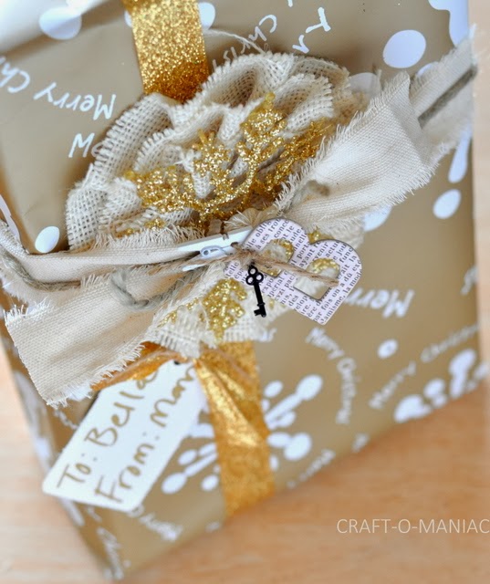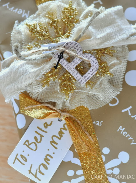With Christmas around the corner, I thought it would be fun to share a pretty gift wrap idea with Canvas Corp products. I did use a cute letter “B” chip board piece by 7 Gypsies, but everything else I used minus the glitter ribbon and gift wrap is from Canvas Corp. I don’t know about you all, but I think half the gift or at least 80% of the gift is the packaging. Its so special to receive a beautiful package and it shows the extra thought and love you put into it.