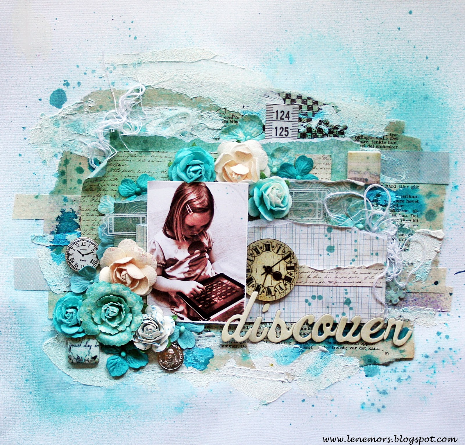 Can you see my passion for glimmermist ? I love to spray and discover new ways of using the glimmermist. On this layout I have used to types of glimmer mist – Bahama Blue  and Aquamarine