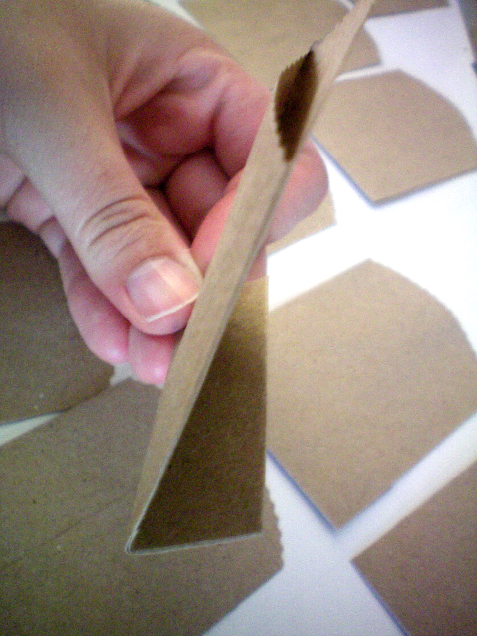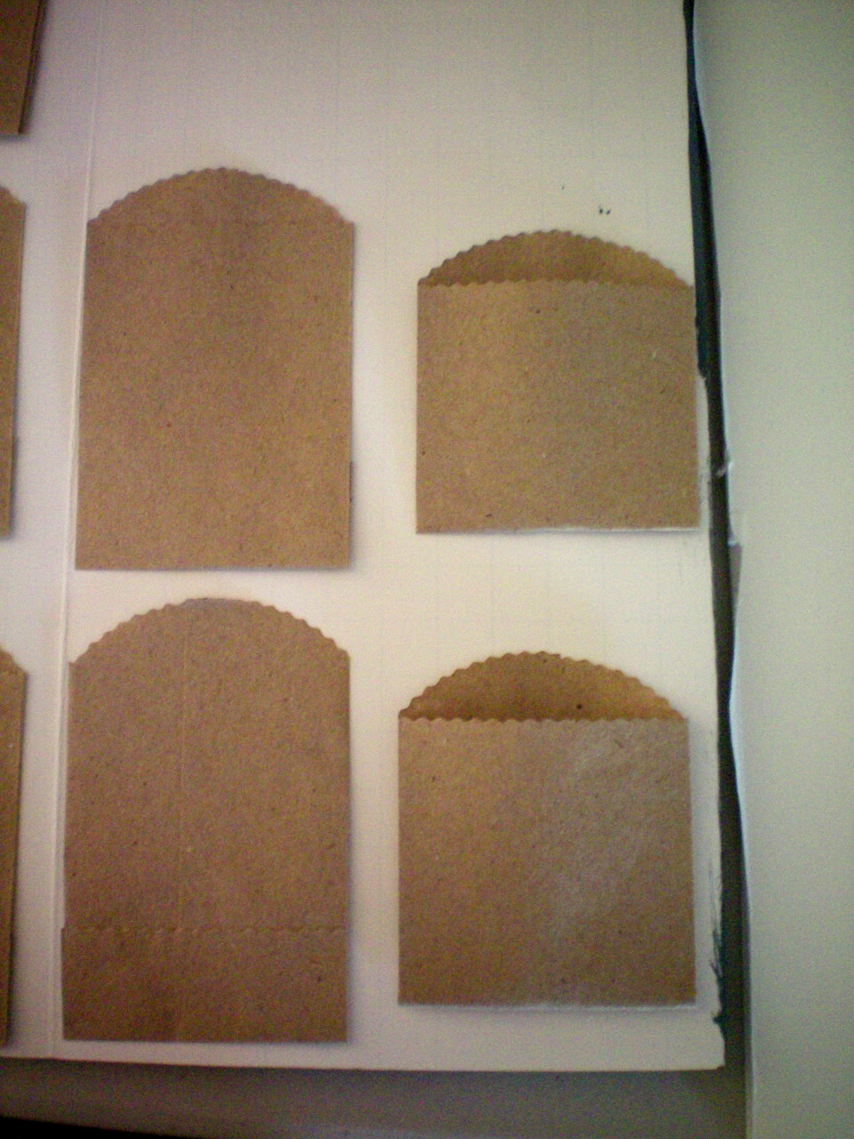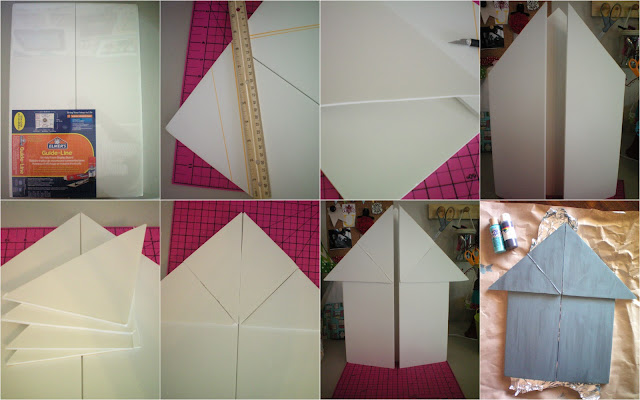 Elmer’s tri-fold- styrofoam board. I new the minute I pulled it out, I was going to make a Haunted House Advent with it. What I didn’t know is that it would be a long 8-9Â hr project. Less time if you don’t have kids to take care of. I loved every second I spent making this. The Collage you see shows you my basic step by step tutorial to getting the Haunted House look. I used a hot glue gun to glue the cut triangle pieces to the board. I mixed turq. and black acrylic paint to get a semi dark and ugly Haunted House color.