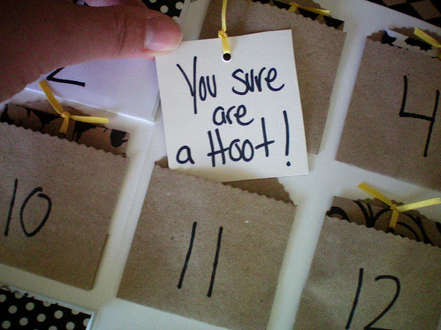 because the brown paper bags only came with 25 and I needed “31” I improvised with the white envelopes. I think its cute with a little mix up. Plus when the kids flip up the envelope lids.. they say things like “AHHHH” “EEK” “SCREAM” “BOO”.