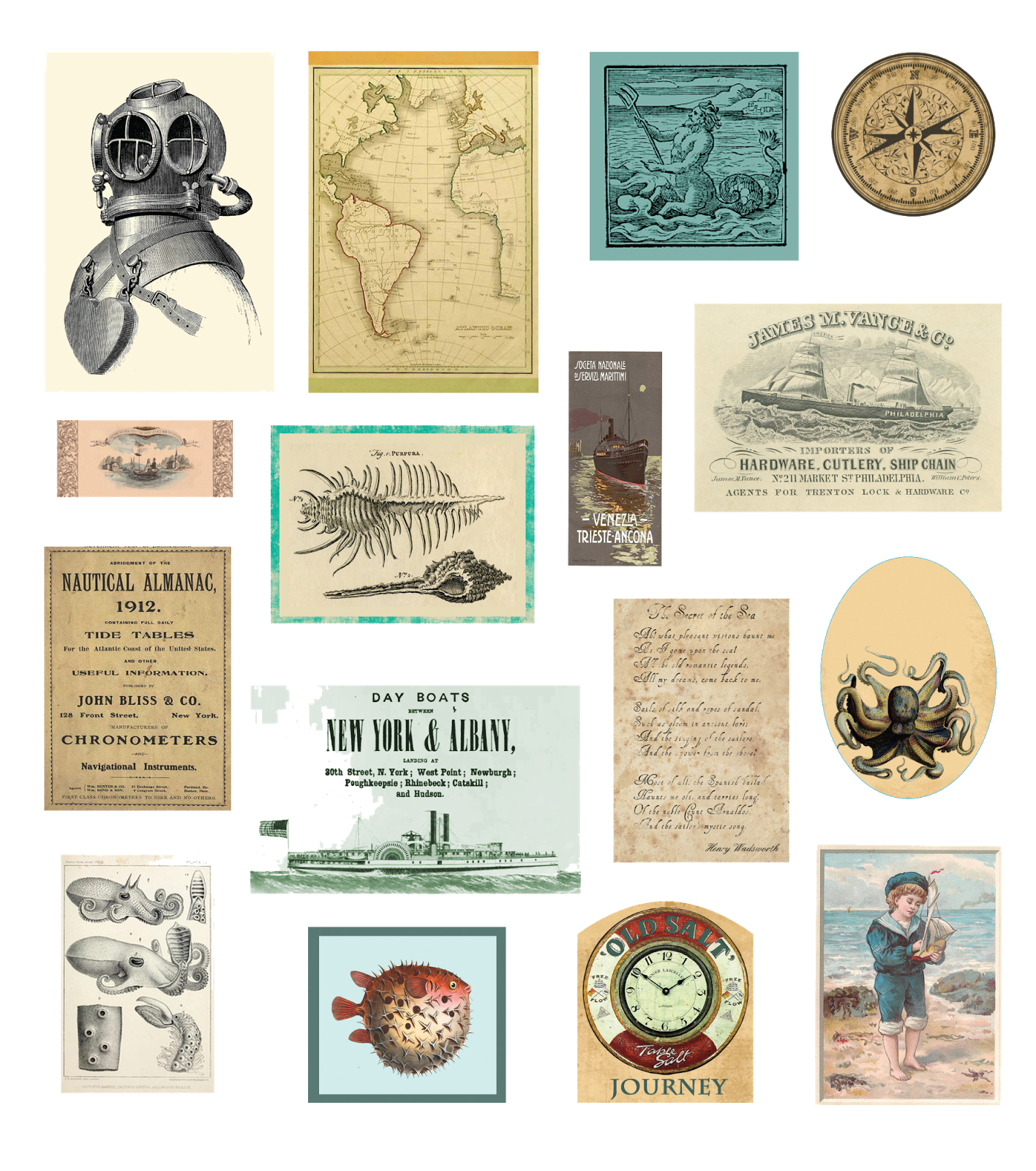 Every so often, our travels through land give us a hankering for the aqua…Traveling gypsies we may be, but we long to be lost at sea. The desire for seafaring adventure inspired us to create a collection that captures a vintage spirit of oceanic travel. Our kindred clan of gypsies created an ensemble of beautiful products with art capturing the rolling tides of the sea, oceanic maps of days gone by, the mysteries of the aquatic and a unique collection of vintage ephemera all with nautical inspiration. This collection is all you need to bring your seafaring projects to life whether they be on shore, boardwalk, sea, vessel, beach or backyard–the perfect ensemble to anchor down your memories.