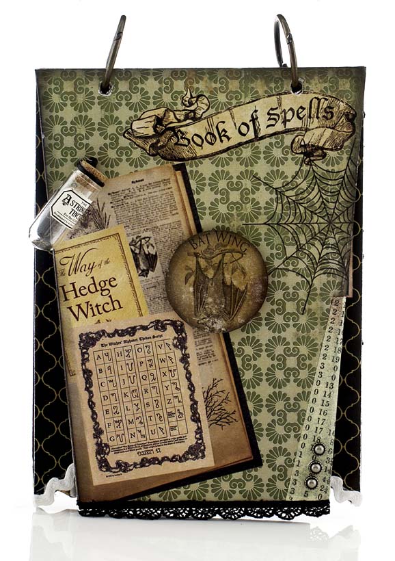 Every witch has her “book of spells” whether it be a magic potion or recipes for a Halloween party. Layers of pages from the book adorn the front while a wicked layered damask adorn the back.