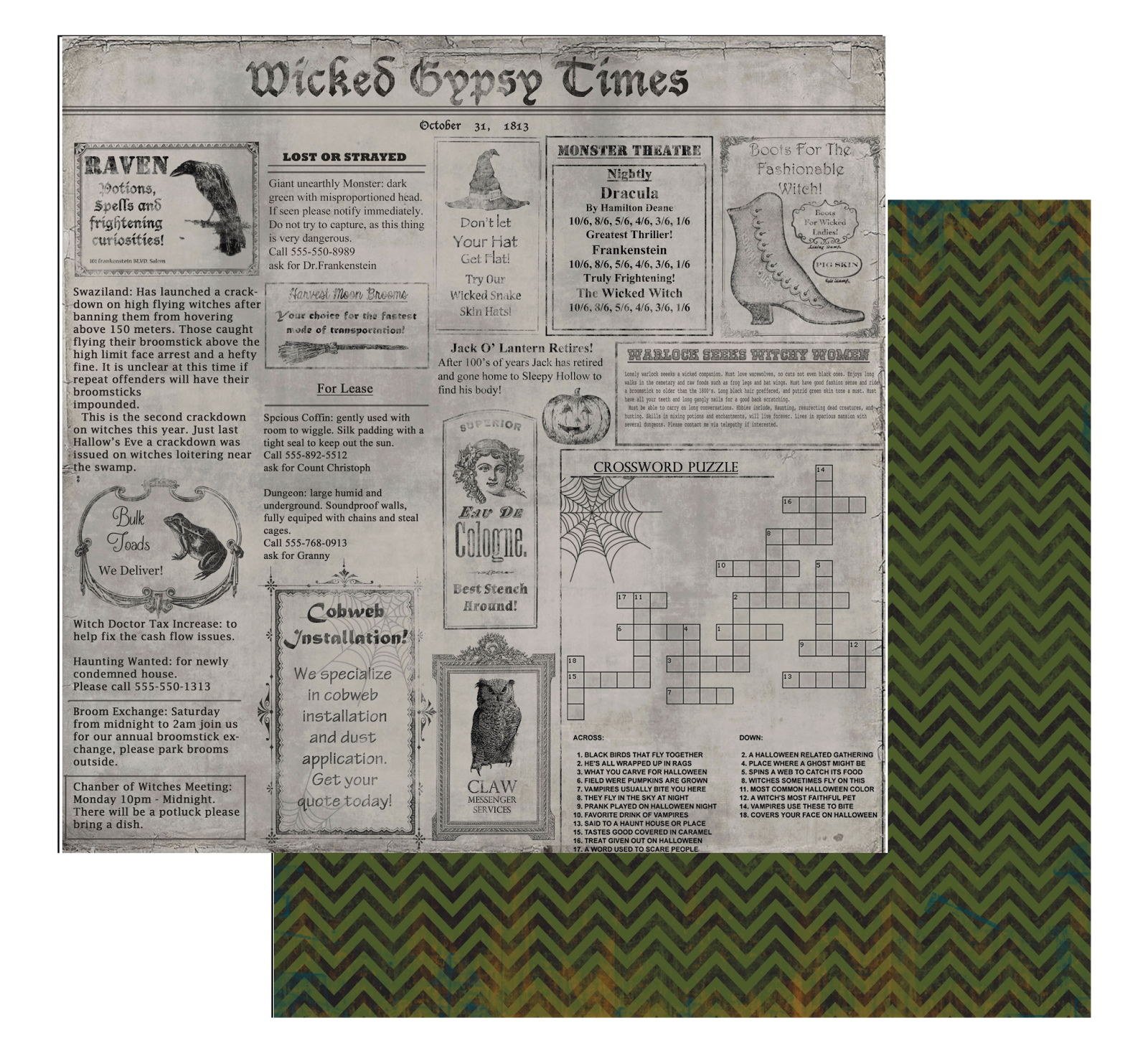 A vintage interpretation of the 31 days of All Hollow’s Eve, our Wicked Gypsy line was inspired by our love of Halloween and all the amazing art and ephemera that comes with it. In this collection you’ll find a rendering of the life of a Halloween Witch through tantalizing advertisements for brew and broomsticks, a floor plan of a haunted abode and even a page from the local newspaper. Now you can capture your favorite All Hollow’s Eve moments with the Wicked Gypsy Collection: