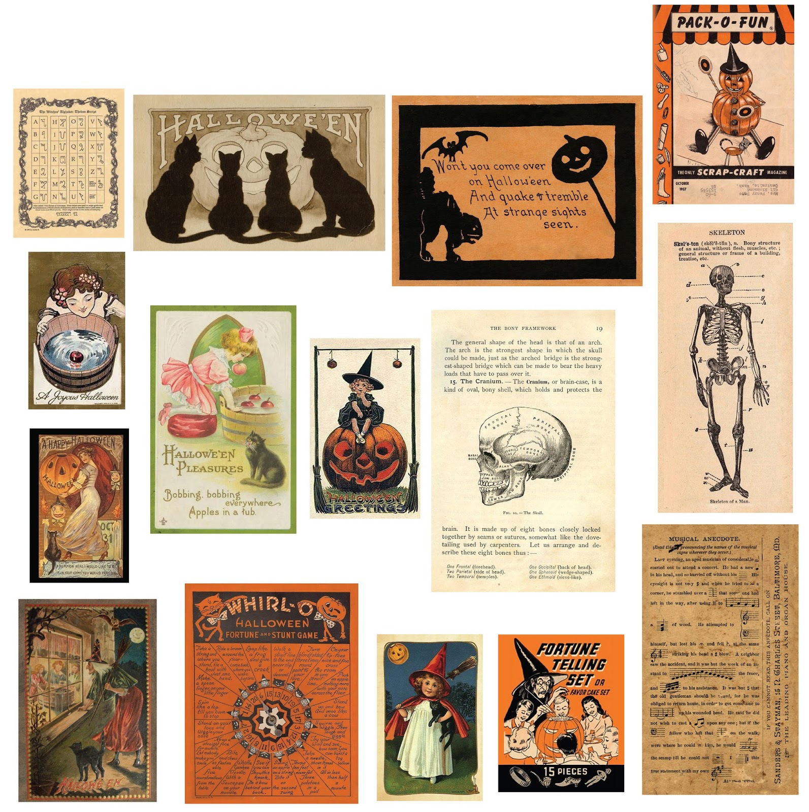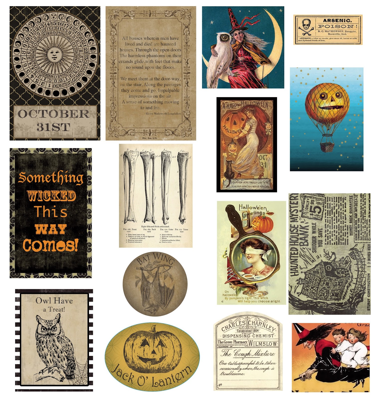 Measuring exactly 5 x 7, these 2 sided journal pages capture the vintage feel of the collection and are the perfect starting ground for your next Halloween mini book, book of spells or feature for your favorite haunting ATC cards.Layer them with textures of burlap, canvas, ticking or maybe even a bit of black satin or lace…