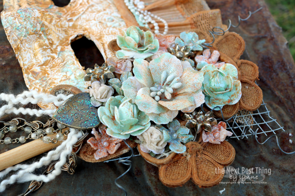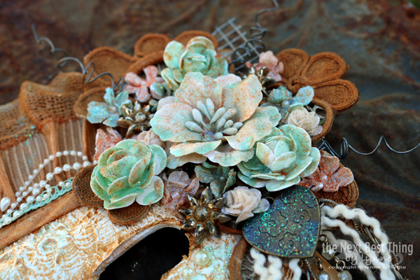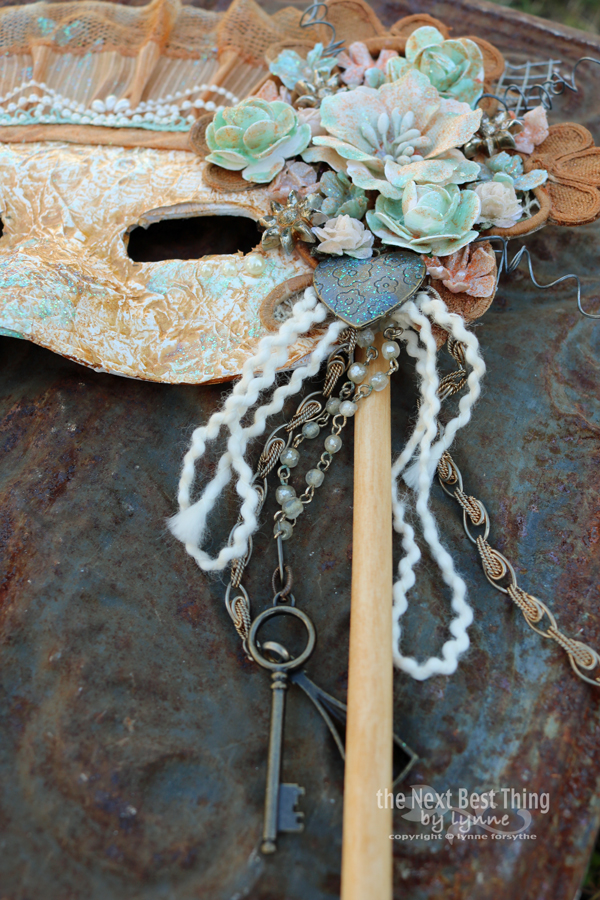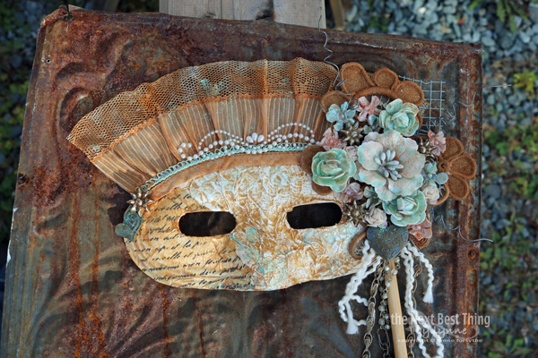 The top of the mask is vintage lace that has been painted with Tattered Angels ~ Glimmer Glam ~ Camel. I just LOVE how it stiffens the fabric.