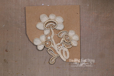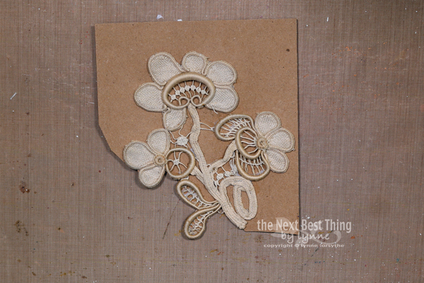 Next, I picked out a bit of vintage applique and adhered it to a piece of CCB Kraft Cardstock for strength. When dry, I cut out the applique and then painted it with Tattered Angels ~ Glimmer Glam ~ Camel.