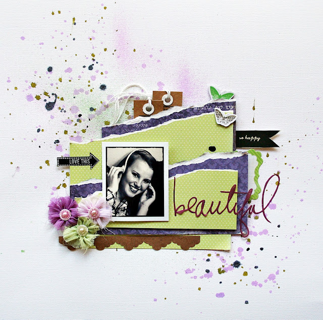 My second project is this layout. I love this color combo – purple and green. On this one I have uses Glimmermist Key Lime and Chalkboard Grape Ape. The black spots are Glimmermist Beetle Black